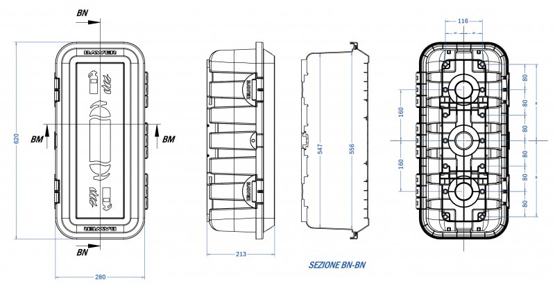 Je uspôsobený na montáž na stenu alebo uchytenie do áut, s možnosťou do neho hasiaci prístroj zvisle umiestniť a upevniť objímkami. Výplň dvierok obsahuje presklený priehľad. Box je uzatvárateľný plastovými sponami.
